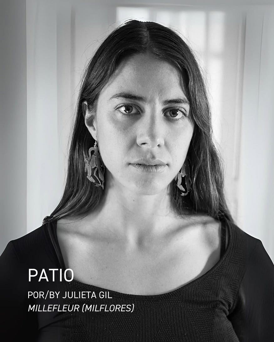 En la sección Patio, la artista Julieta Gil (Ciudad de México, 1987) presenta la instalación Milflores, una propuesta que surge a partir de archivos fotográficos y mapeo digital de la vegetación urbana. El proyecto, respaldado por Fomento Cultural BBVA y la Universidad Iberoamericana, explora la hibridez entre espacio natural y virtual a través de documentación multimedia de los recorridos urbanos de Gil.